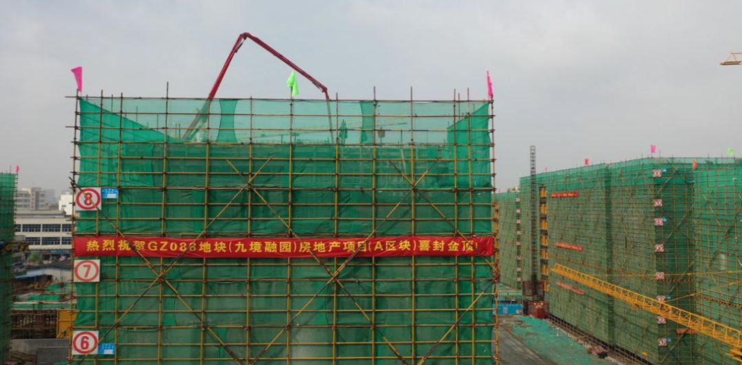 9月18日一早,九境融園項(xiàng)目施工現(xiàn)場萬里晴空、惠風(fēng)和暢,寫著“熱烈祝賀GZ088地塊(九境融園)房地產(chǎn)項(xiàng)目(A區(qū)塊)喜封金頂”字樣的橫幅格外閃耀。伴隨著3、5號(hào)樓屋面頂板混凝土澆筑,在建設(shè)單位、監(jiān)理單位及施工單位的共同見證下,九境融園項(xiàng)目A區(qū)塊工程正式完成全部主體結(jié)構(gòu)的封頂。