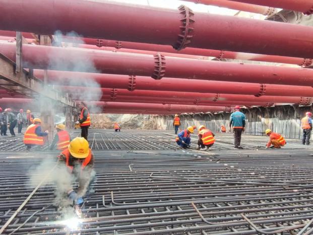 為保證首塊底板優(yōu)質(zhì)高效完成澆筑,項(xiàng)目部高度重視施工安全和工程質(zhì)量,并充分做好施工前各項(xiàng)準(zhǔn)備工作。一是確保項(xiàng)目管理人員和作業(yè)人員安全、技術(shù)交底到位;二是落實(shí)領(lǐng)導(dǎo)帶班制、旁站制及三檢制,嚴(yán)把混凝土原材料質(zhì)量關(guān),澆筑過(guò)程中技術(shù)人員全程盯控,嚴(yán)格按照施工工藝施工,實(shí)現(xiàn)質(zhì)量控制目標(biāo);三是安全員從過(guò)程上嚴(yán)格監(jiān)督安全隱患,堅(jiān)持早發(fā)現(xiàn)、早報(bào)告、早解決,做好安全防范工作。