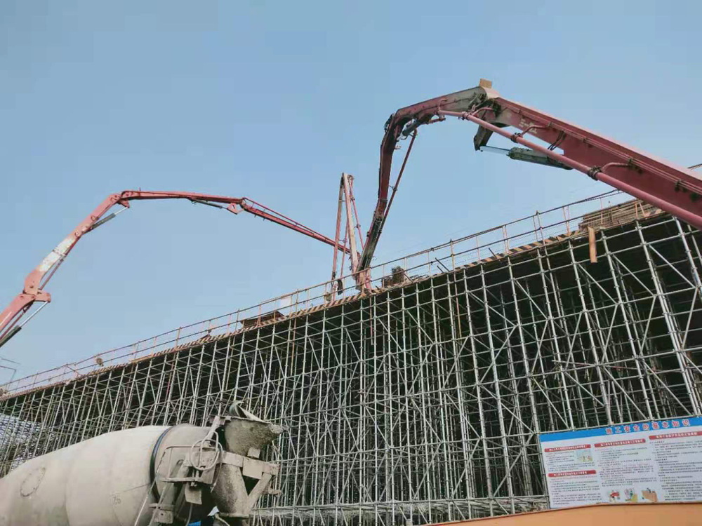 此次澆筑的箱梁底腹板為潤揚路快速化改造工程中長度最長、工程量最大的段面,共三跨、125米,共計澆筑1800m3。第六聯(lián)現(xiàn)澆箱梁上跨楊柳青路,跨徑為35米、55米、35米,采用門洞支架施工,確保楊柳青路正常通行。門洞采用兩跨的形式,凈高5米,單跨寬7.5米,能夠保證車輛正常通行。項目主線高架橋橋梁全長1129.63米,共13聯(lián),其中12聯(lián)為預應力混凝土連續(xù)箱梁,1聯(lián)為鋼箱梁。