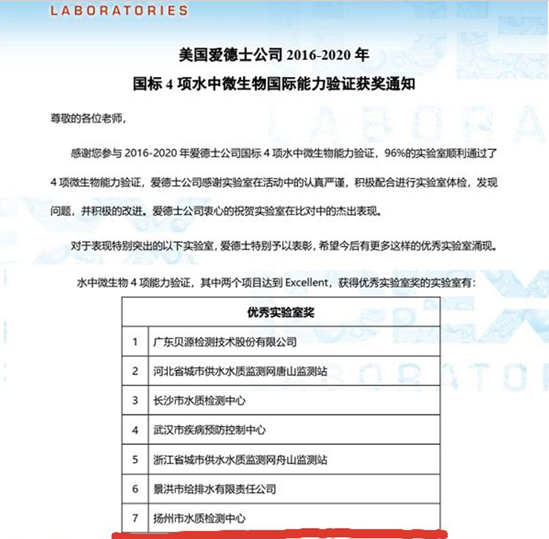 近日,城控集團長江水務(wù)公司水質(zhì)檢測中心榮獲美國愛德士公司組織的國標(biāo)4項水中微生物國際能力驗證活動優(yōu)秀實驗室獎。