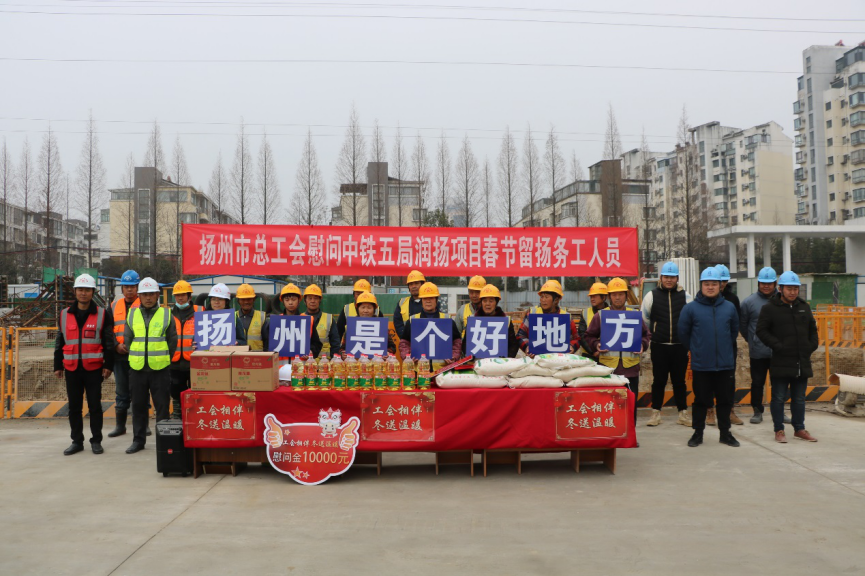 2月5日下午,揚州市總工會副主席洪慧娟一行來到潤揚路快速化改造工程施工現(xiàn)場,看望慰問春節(jié)留揚務(wù)工人員。