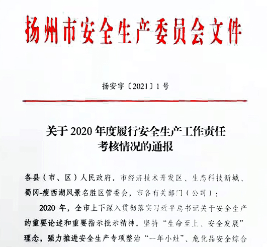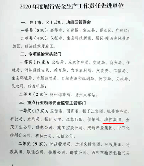 2020年,城控集團(tuán)深入貫徹落實(shí)習(xí)近平總書(shū)記關(guān)于安全生產(chǎn)重要論述,堅(jiān)持“生命至上、安全發(fā)展”理念,強(qiáng)力推進(jìn)安全生產(chǎn)專(zhuān)項(xiàng)整治,創(chuàng)新工作舉措,順利完成市安委會(huì)下達(dá)的目標(biāo)任務(wù),為揚(yáng)州市全年事故起數(shù)和死亡人數(shù)大幅“雙下降”貢獻(xiàn)城控力量,被市安委會(huì)表彰為2020年度履行安全生產(chǎn)工作責(zé)任先進(jìn)單位一等獎(jiǎng)。