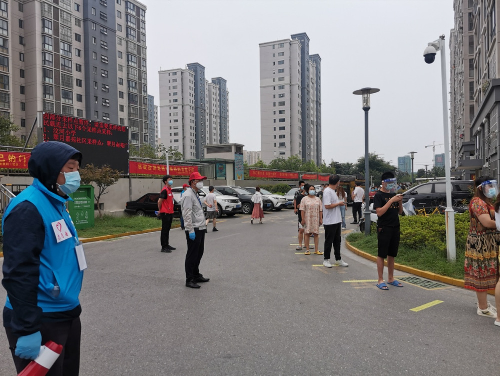 “請大家排好隊,保持一米以上安全距離,不要造成人員聚集,請?zhí)崆皽蕚浜媚愕纳矸葑C……”志愿者不斷提醒居民注意。在翠月花園核酸采集點,志愿者們穿梭在排隊人群中,邊安撫居民緊張情緒,邊引導居民即測即走?!半m然天氣很悶熱,工作量很大,但是我們有信心能保質保量完成全小區(qū)核酸檢測任務?!彼麄儾活櫤韲邓粏?,依舊熱情且耐心地回答居民的問題,引導現場秩序。11日下午,雨淅淅瀝瀝下個不停。雖然避雨棚近在咫尺,但志愿者們面對風雨寸步不離崗位,他們笑著說道“這點風雨算啥呀?”一周來,志愿者們協(xié)助社區(qū)開展了4次核酸檢測,共檢測居民約12000人次。