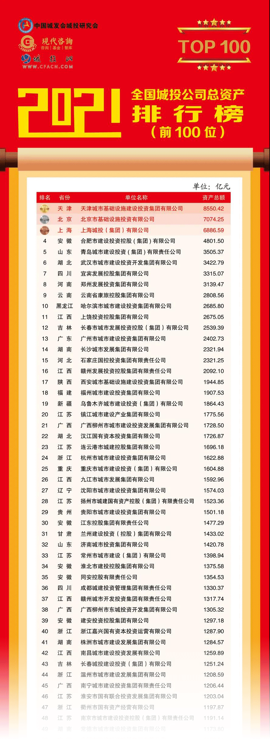 該排行榜由中國城市發(fā)展研究會城市建設投融資研究專業(yè)委員會(簡稱”中國城發(fā)會城投研究會”)、江蘇現(xiàn)代資產投資管理顧問有限公司(簡稱“現(xiàn)代咨詢”)和城投網聯(lián)合發(fā)布,迄今已連續(xù)發(fā)布8年,主要反映全國城投公司規(guī)模變化的總資產排名情況,目前已成為全國城投行業(yè)群體發(fā)展狀況和城投轉型升級的權威發(fā)布。