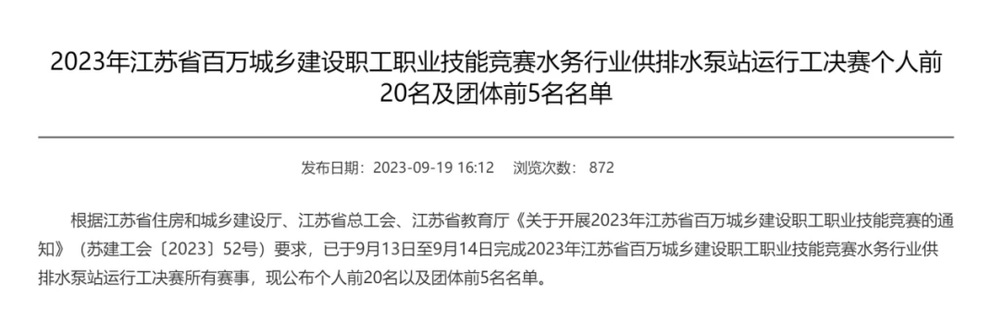 近日,江蘇省住房和城鄉(xiāng)建設(shè)廳公布了“2023年江蘇省百萬城鄉(xiāng)建設(shè)職工職業(yè)技能競賽水務(wù)行業(yè)供排水泵站運行工決賽”個人前20名及團體前5名名單。長江水務(wù)選手在全省近百名參賽選手的激烈角逐中表現(xiàn)出色、取得佳績,丁杰、龔委、譚寶龍位列個人成績前20名,均榮獲“優(yōu)秀選手”稱號,其他選手也正常發(fā)揮取得較好排名,揚州代表隊榮獲團體總分第5名。
