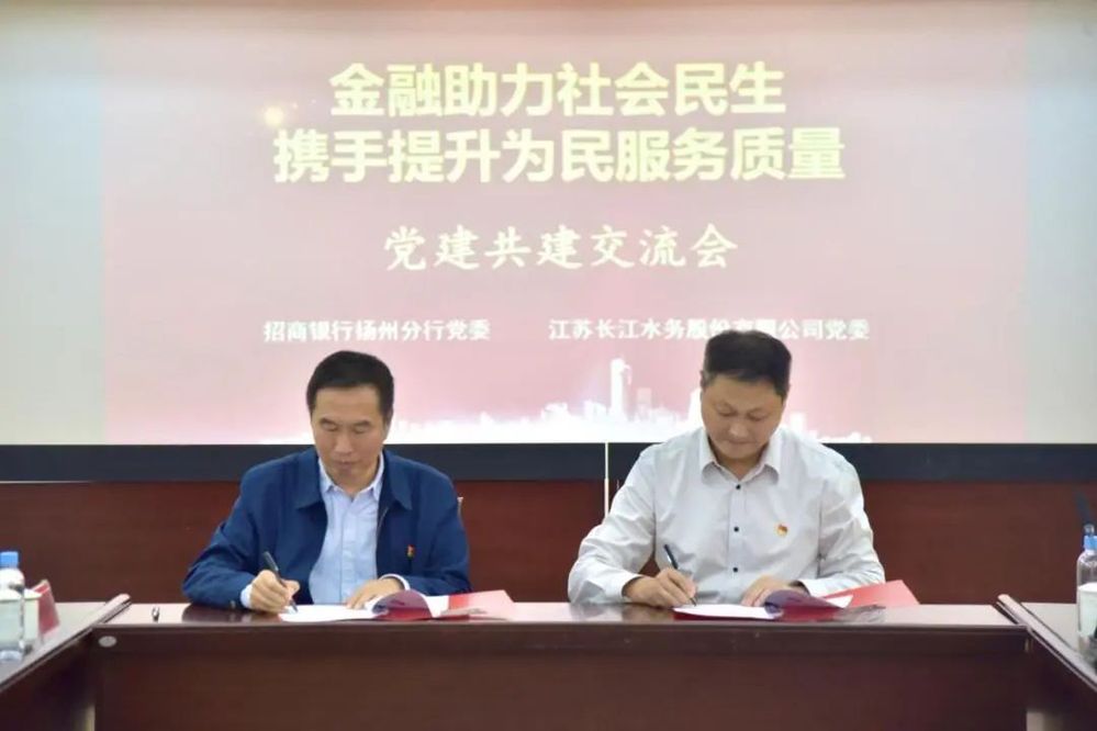 招商銀行揚州分行一行人員首先參觀了長江水務(wù)寶帶營業(yè)大廳、第五黨支部黨員活動室和供水調(diào)度(客服)中心。隨后,共建雙方分別介紹了經(jīng)營發(fā)展情況,就提高服務(wù)質(zhì)量和服務(wù)能力等開展了座談交流。城控集團(tuán)黨委委員、長江水務(wù)黨委書記、董事長張正斌和招商銀行揚州分行黨委書記、行長喻坤簽署《黨建共建協(xié)議書》。