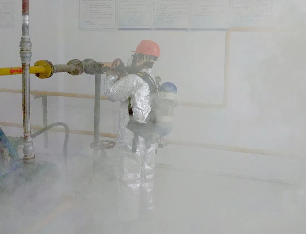 第二階段演練模擬壓縮機房發(fā)生泄漏。演練人員先切斷所有電源,關閉閥門,疏散無關人員。上報公司后,組織人員迅速穿戴防護服與正壓式呼吸器進入現場,在判定為法蘭連接處為泄漏點后,使用不發(fā)火工具,對泄漏部位進行搶修,再使用可燃氣體檢漏儀對泄漏點進行檢查,確保無泄漏。