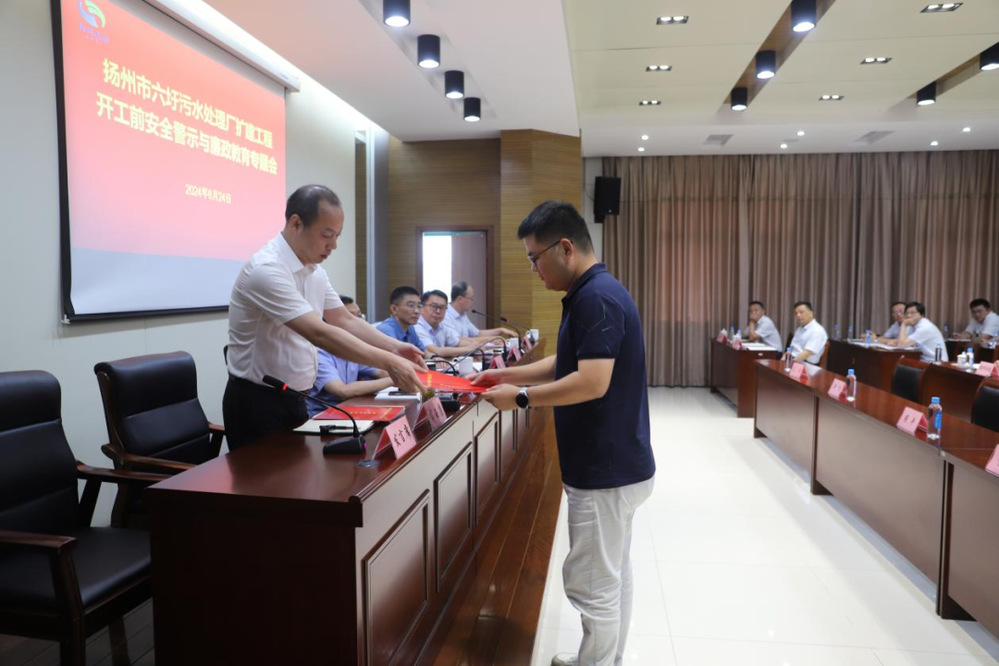 為確保六圩污水處理廠擴(kuò)建工程順利開工建設(shè),做好工程建設(shè)期間的廉政工作,打造優(yōu)質(zhì)工程與廉潔工程,6月24日下午揚州潔源環(huán)境股份有限公司召開一期安全警示與廉政教育專題會。城控集團(tuán)黨委副書記徐飛、副總經(jīng)理周平、企管部副部長李剛、潔源環(huán)境公司領(lǐng)導(dǎo)班子成員、駐項目安全管理人員、參建單位分管負(fù)責(zé)人和項目安全管理人員參會。