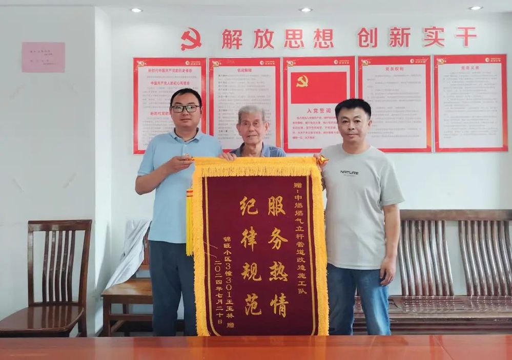 2024年7月26日,一個平凡的星期五,對于揚州中燃客服部來說,卻是一個充滿溫暖和感動的日子。來自錦旺社區(qū)居民代表王玉林老先生冒著酷暑送來了一面錦旗,上面繡著“服務(wù)熱情,紀律規(guī)范”幾個大字,這面錦旗是對揚州中燃燃氣立管改造工作的認可。