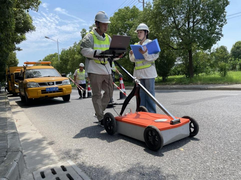 休息片刻,消退些暑熱后,楊帆利用雷達(dá)探測設(shè)備,給附近路面“拍CT”。不遠(yuǎn)處,樹蔭下乘涼的幾位居民好奇地張望,似乎想來湊熱鬧,可又舍不得陰涼。楊帆介紹,由于地下管網(wǎng)錯(cuò)綜復(fù)雜,水流滲漏沖刷泥土?xí)斐傻叵驴斩?,給市民出行帶來安全隱患?!拔覀児緦iT引進(jìn)了先進(jìn)的雷達(dá)探測設(shè)備,定期對道路進(jìn)行‘體檢’,及時(shí)消除安全隱患”。楊帆一路走去,后背的道道鹽霜格外醒目。