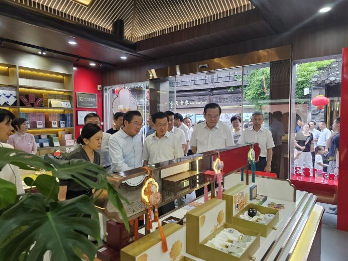 王立平一行沿東關古街,實地察看周邊風貌,了解街區(qū)歷史沿革和文旅資源保護利用等情況,深入冬榮園、謝馥春、街南書屋、揚州漆器廠等店鋪商家,聽取情況介紹,詳細了解街區(qū)招商、老字號傳承、文商旅產(chǎn)業(yè)融合工作所取得的成效,并對揚州城控集團堅持保護與利用、改造與復興、傳承與發(fā)展相結合理念,扎實推進古城項目建設和經(jīng)營管理方面取得的成績予以了充分肯定。