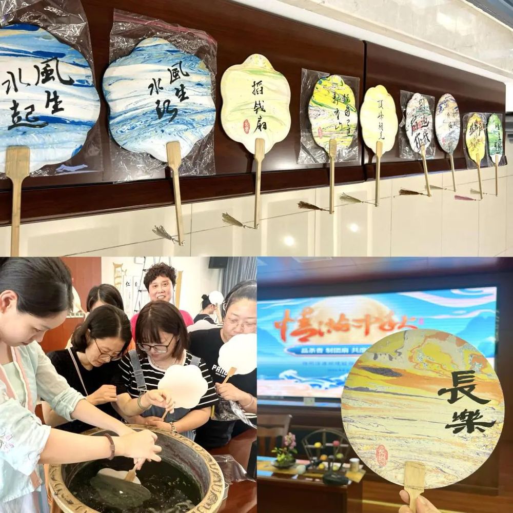 以“漆”為畫(huà),以“扇”為紙,一半人為,一半天成,入水為止,姿態(tài)萬(wàn)千。大家紛紛拿起手中的空白扇子,發(fā)揮自己的創(chuàng)意,經(jīng)過(guò)打底、上色、晾干多道工序,一把把獨(dú)特的古風(fēng)漆扇呈現(xiàn)在眼前,大家紛紛展示著自己的作品,臉上洋溢著幸福的笑容。