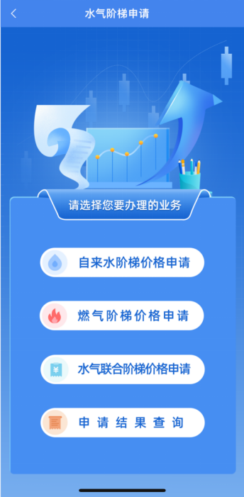 03選擇申請辦理業(yè)務(wù)進入“水氣階梯申請”,根據(jù)自身需要辦理的業(yè)務(wù)點擊相應(yīng)的按鈕,若自來水和燃氣均需申請,點擊“水氣聯(lián)合階梯價格申請”。
