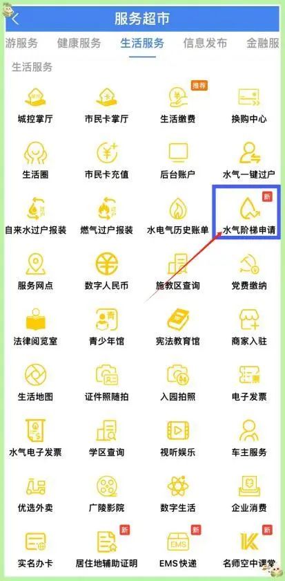 02進入水氣階梯申請頁面打開我的揚州APP,點擊“功能欄”的更多,進入“服務(wù)超市—生活服務(wù)”,找到“水氣階梯申請”。