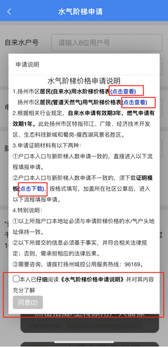 04查看申請說明瀏覽申請說明的各事項,查看階梯價格表、可辦理地區(qū)、所需材料等內(nèi)容,勾選知曉和同意按鈕后,進入業(yè)務(wù)辦理界面。