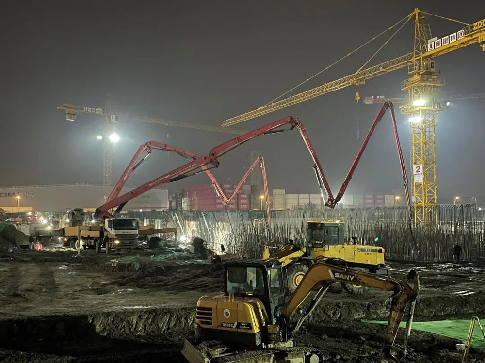 施工現場,商品混凝土運輸車連續(xù)運輸,不間斷供應2臺泵車同時作業(yè),數名工人邊澆筑邊振搗,并用抹子抹平、壓實,閉合收水裂縫,確保底板混凝土分層分段、澆筑均勻、振搗密實、表面平整。本次底板澆筑采用C30混凝土,共耗時一晝夜,累計澆筑混凝土約1750立方米。
