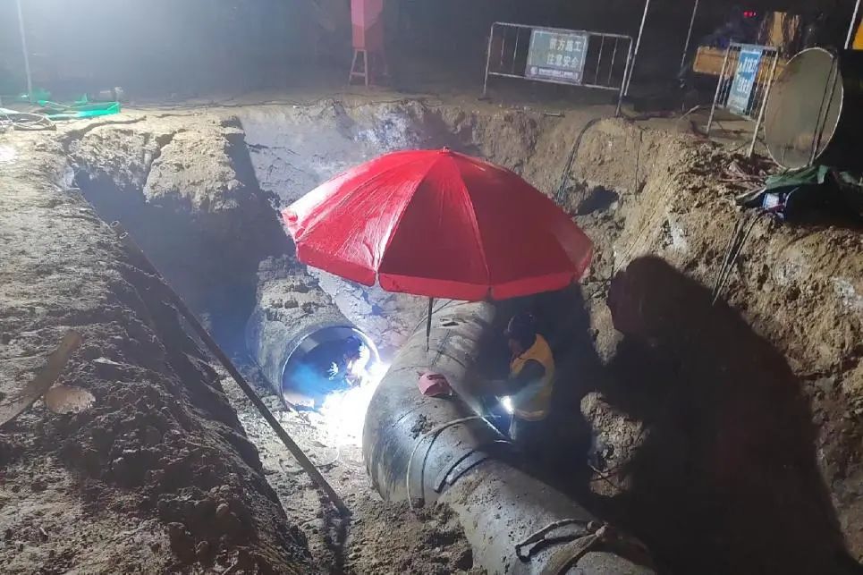 晚10時,隨著閥門的關(guān)閉、管道內(nèi)余水的排空,管道碰接正式開始,3個碰接點同時施工,施工人員全神貫注,施工現(xiàn)場燈火通明、機器轟鳴,一切有條不紊、井然有序……