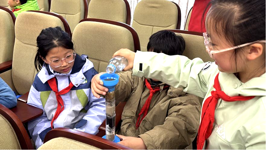 隨著過濾裝置制作完成,小記者們將臟水緩緩倒入過濾器,緊盯著水流經(jīng)過每一層過濾材料,經(jīng)過實(shí)驗(yàn)裝置的處理,原本渾濁的臟水逐漸變得清澈透明?!巴郏娴淖兦辶?!”當(dāng)清澈的水從過濾器底部緩緩流出時(shí),不少同學(xué)驚呼出聲,臉上洋溢著喜悅的笑容?!拔矣X得這個(gè)實(shí)驗(yàn)太神奇了!沒想到經(jīng)過簡單的幾個(gè)步驟,就讓水質(zhì)有了明顯改善。”梅嶺小學(xué)四(10)班的劉同學(xué)激動地說道。小記者們紛紛表示,此次科普活動不僅讓他們了解了飲用水安全的重要性,還在實(shí)踐中培養(yǎng)了觀察、思考和動手的能力。在活動的最后,現(xiàn)場進(jìn)行了有獎問答環(huán)節(jié),小記者們都非常踴躍地回答問題,大家對于制水、凈水、節(jié)水,都有了更加深刻的理解。