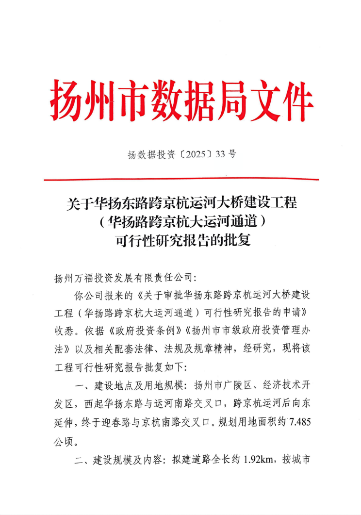 華揚(yáng)東路跨京杭運(yùn)河大橋建設(shè)工程是2025年揚(yáng)州市級政府投資計劃的重點(diǎn)項目,是揚(yáng)州城區(qū)二十五橫十七縱主干路網(wǎng)的關(guān)鍵節(jié)點(diǎn)。項目建成后將有效緩解區(qū)域交通擁堵,形成更為完善的跨河交通體系,為沿線產(chǎn)業(yè)布局優(yōu)化和城市空間拓展提供有力支撐。