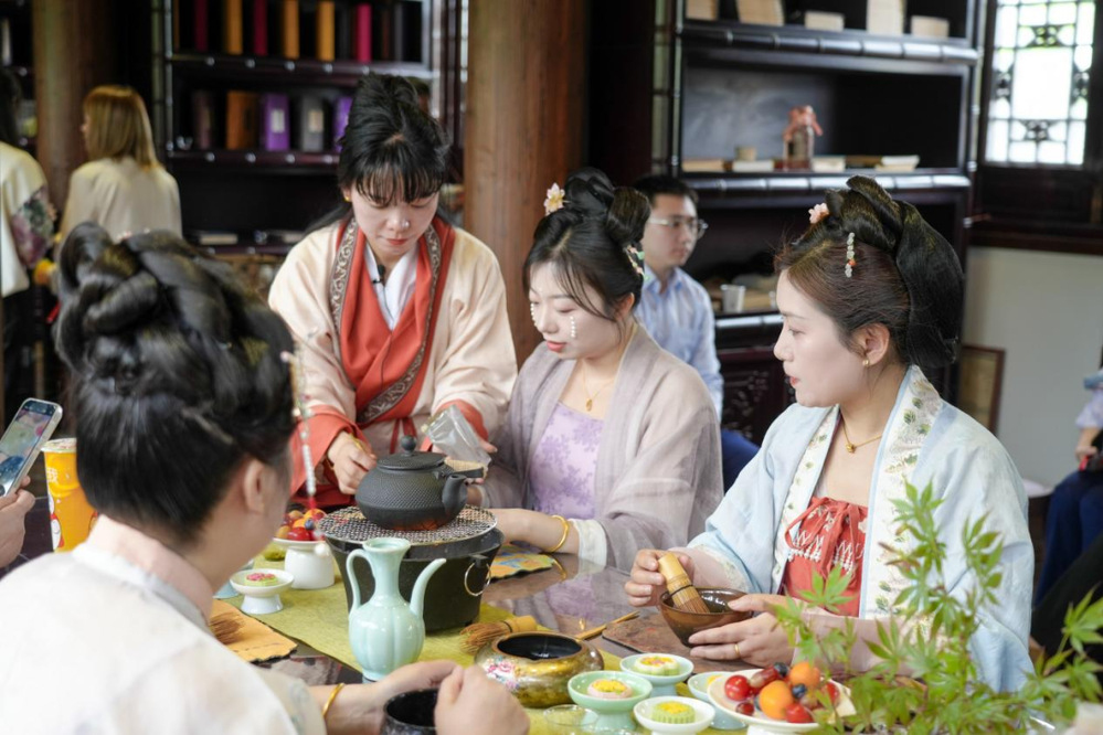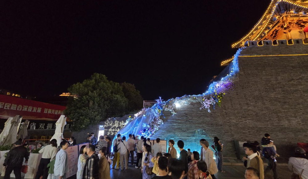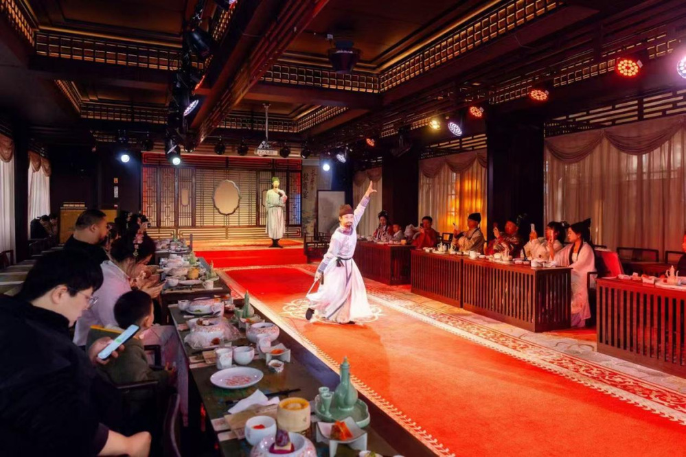 從謝馥春香粉店旁的“淮揚(yáng)早茶體驗(yàn)區(qū)”到街尾的“老字號(hào)美食長(zhǎng)廊”,街區(qū)串聯(lián)起揚(yáng)州美食文化精髓。三和四美醬園現(xiàn)場(chǎng)熬制“櫻花腐乳”,將傳統(tǒng)工藝與春日風(fēng)物融合;揚(yáng)大酸奶、漢森熊啤酒等網(wǎng)紅美食與霸王茶姬國(guó)風(fēng)茶飲形成混搭風(fēng)潮,滿足年輕群體的多元需求。夜經(jīng)濟(jì)版圖持續(xù)拓展:芍藥園子書場(chǎng)評(píng)話聲聲入耳,長(zhǎng)樂鹽商宴再現(xiàn)鹽商雅集盛景,形成日賞非遺、夜享雅韻的全時(shí)段體驗(yàn)閉環(huán)。數(shù)字科技為古街注入新活力,街區(qū)東門城樓引入VR全景漫游、AI互動(dòng)等前沿技術(shù),在東關(guān)城樓打造《創(chuàng)世·山海經(jīng)》沉浸式數(shù)字文化展,吸引約3000名游客穿越上古神話世界,虛實(shí)相生的光影藝術(shù)讓傳統(tǒng)文化煥發(fā)時(shí)尚魅力。