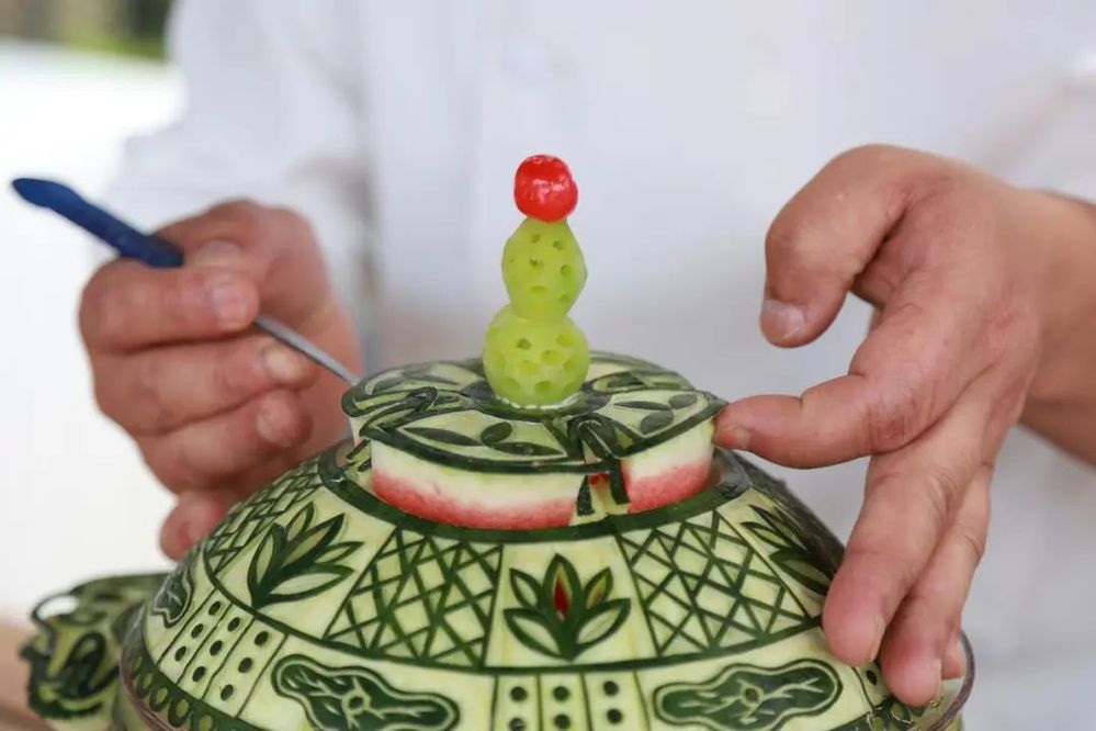 活動現(xiàn)場精心設(shè)置25個非遺美食展位,多位非遺傳承大師現(xiàn)場展示精湛廚藝。細(xì)如發(fā)絲的文思豆腐、精雕細(xì)琢的食雕作品、鮮而不膩的獅子頭、粒粒分明的揚(yáng)州炒飯、皮薄餡多的湯包,引得賓客紛紛駐足品鑒。
