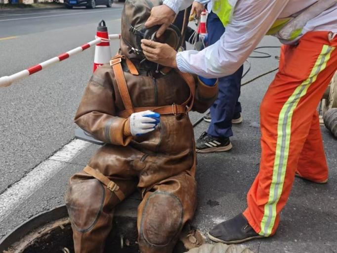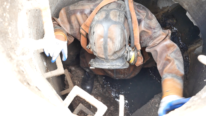對于井室和管道內(nèi)存在的大塊水泥和混凝土,常規(guī)方法難以清除,只能通過人工下井清掏。穿上厚重的防護(hù)服、戴上防毒面具、系好安全繩,相榮慢慢降入井中。管道內(nèi)悶熱潮濕、空氣混濁?!熬聹囟缺鹊孛孢€高,像蒸桑拿?!痹谥睆絻H700mm的井室內(nèi),相榮用風(fēng)鎬將水泥塊打碎,并用小桶將打碎的水泥碎塊裝進(jìn)去,再由井上面的輔助人員一桶一桶的拎上來,并及時裝入垃圾袋,當(dāng)天集中清運。經(jīng)過兩個小時的奮戰(zhàn),他們終于疏通了這段兩米多長的堵塞管道。當(dāng)相榮被上面兩個輔助人員通過三腳架及安全繩拉上來時,汗水濕透了他的衣服。