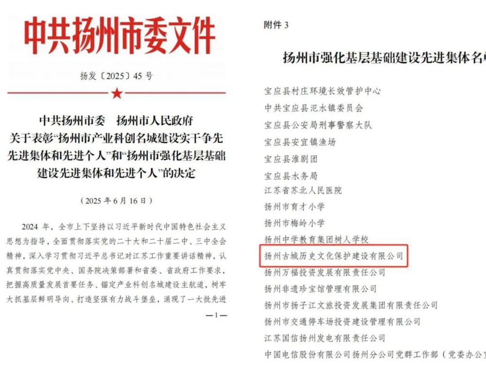 獲此榮譽既是對古保公司在基層建設工作中突出成效的高度肯定,也是對其深耕古城保護與有機更新的有力鞭策。下一步,古保公司將持續(xù)加強基層基礎建設,銳意進取、持續(xù)奮斗,深度挖掘古城多元資源,積極探索歷史文化保護利用傳承與城鄉(xiāng)建設高質(zhì)量發(fā)展相融共進的 “揚州路徑”。