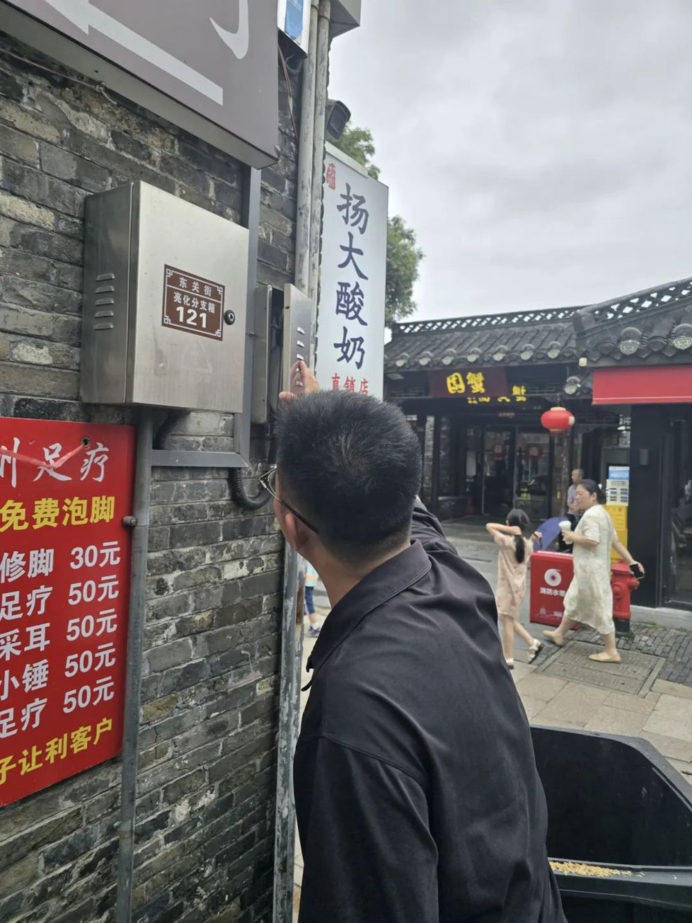 上午10點(diǎn),地表溫度突破40℃。魯毅的工作服已濕透,他正蹲在一家文創(chuàng)店后巷,檢查私拉電線給電動(dòng)車充電的問題?!靶±?,這線路像蜘蛛網(wǎng)一樣,臺(tái)風(fēng)一來準(zhǔn)出問題。”他耐心解釋,并協(xié)助店主聯(lián)系專業(yè)電工重新布線。此時(shí),對(duì)講機(jī)響起:“街區(qū)東門入口客流較大,需要密切關(guān)注!”魯毅立即調(diào)轉(zhuǎn)方向,通過智慧平臺(tái)調(diào)度保安分流人群,同時(shí)用擴(kuò)音器提醒游客:“前面石板路滑,請(qǐng)靠右行走!”