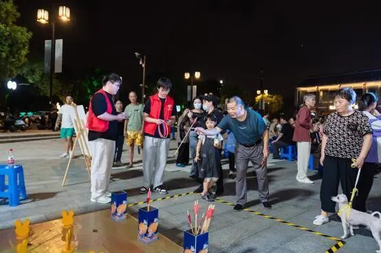 除了文化雅韻,現(xiàn)場(chǎng)設(shè)置了多個(gè)互動(dòng)打卡與市集體驗(yàn)區(qū),讓節(jié)日氛圍更添煙火氣?!拔以谛炷拊铝痢贝蚩c(diǎn)前,居民手持造型精巧的月亮小夜燈定格溫馨瞬間;“玉兔投壺”游戲區(qū)排起長隊(duì),老少同樂間復(fù)刻古代士人的閑情雅趣?!霸鹿馐屑眳R集文創(chuàng)手作、中秋美食等,市民憑游園卡完成互動(dòng)、集齊印章,即可兌換月亮小夜燈和冰皮月餅,將節(jié)日祝?;饔|手可及的溫暖。
