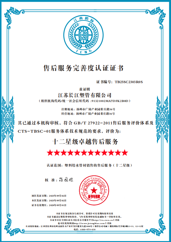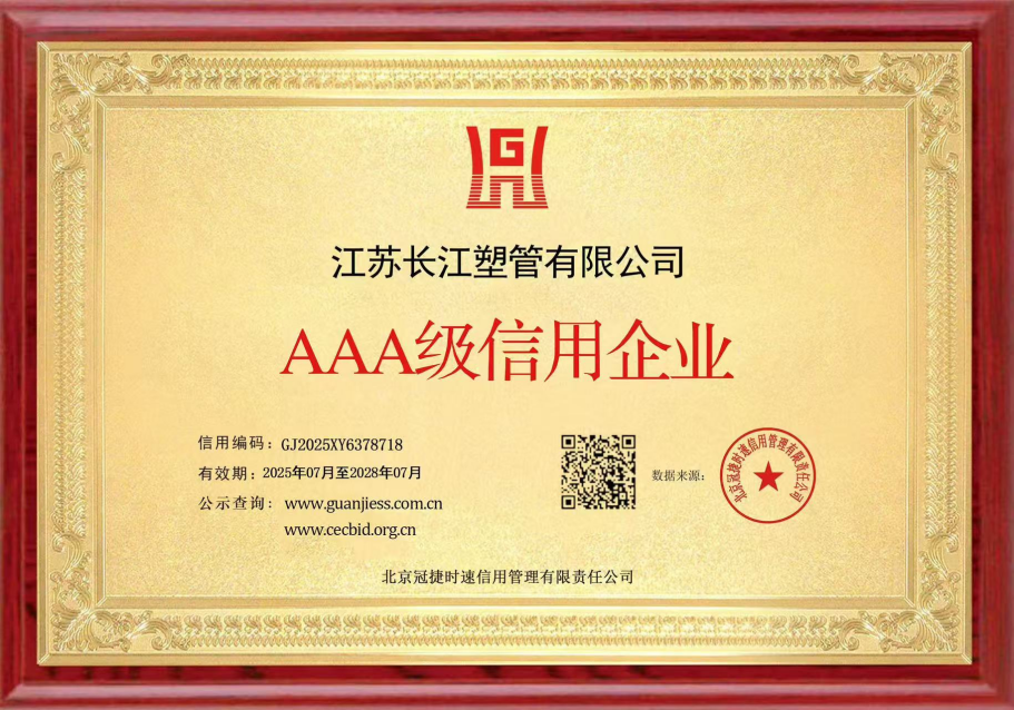 2025年,江蘇長江塑管有限公司接連榮獲AAA級信用企業(yè)蟬聯(lián)認(rèn)證與十二星級卓越售后服務(wù)評價(jià)。這兩項(xiàng)沉甸甸的榮譽(yù),不僅是國家權(quán)威機(jī)構(gòu)的高度認(rèn)可,更是企業(yè)全體員工在生產(chǎn)一線以汗水與擔(dān)當(dāng)書寫的奮斗答卷。