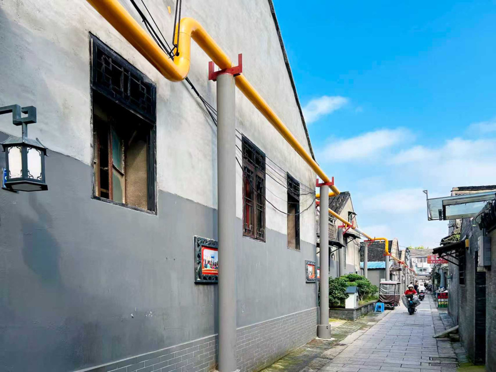 該方案通過(guò)精心設(shè)計(jì)與計(jì)算,在無(wú)法沿墻敷設(shè)管道的狹窄空間內(nèi),采用設(shè)立專用鋼結(jié)構(gòu)立柱的方式,將燃?xì)夤艿婪€(wěn)固地架設(shè)起來(lái),如同為管道建造了“空中走廊”。這一方法有效規(guī)避了老建筑墻體承重不足、巷道過(guò)窄等限制,既保障了管道的安全穩(wěn)固,又最大程度減少了對(duì)原有建筑結(jié)構(gòu)和街巷風(fēng)貌的影響。